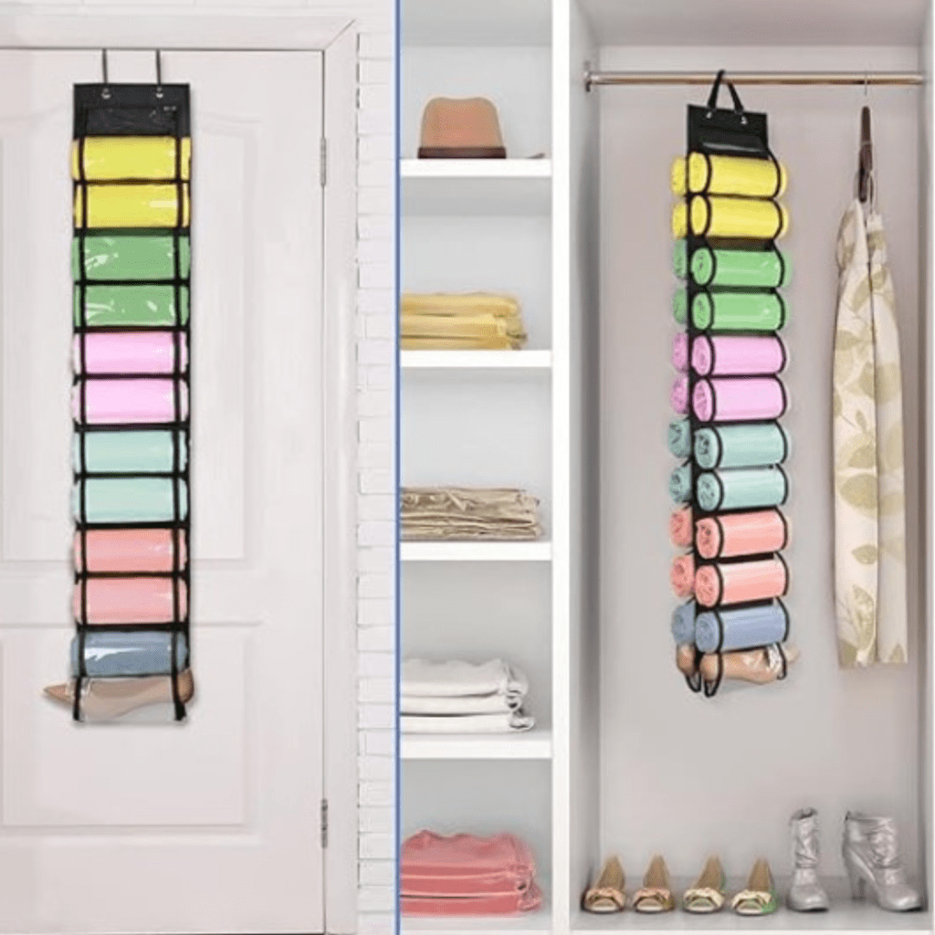 This Hanging Organizer allows you to use your vertical space on a door or below the closet hanging rod. Perfect for leggings, or t-shirts. Includes 24 compartments.