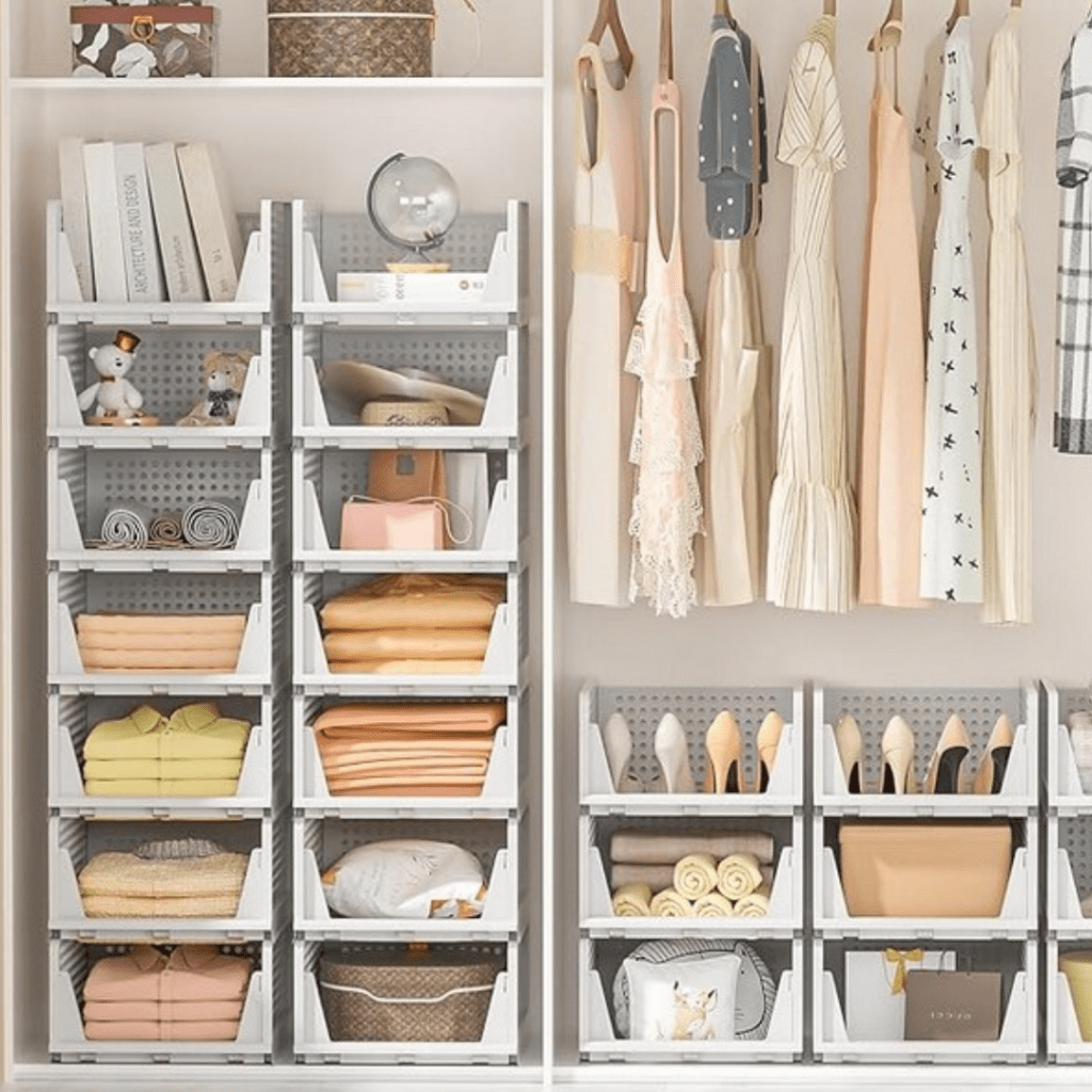 These Foldable Stacking Bins make it possible to make your closet work for you. You can move them around and make the most of vertical space.