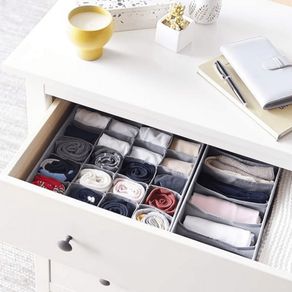 Drawer Organizers like these are a great way to store clothes vertically in your dressers and other drawers. Plus, they come in various sizes.