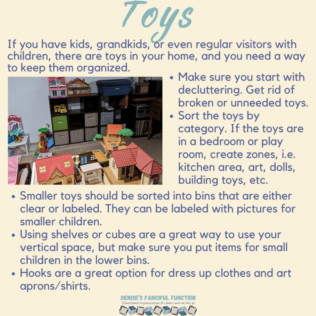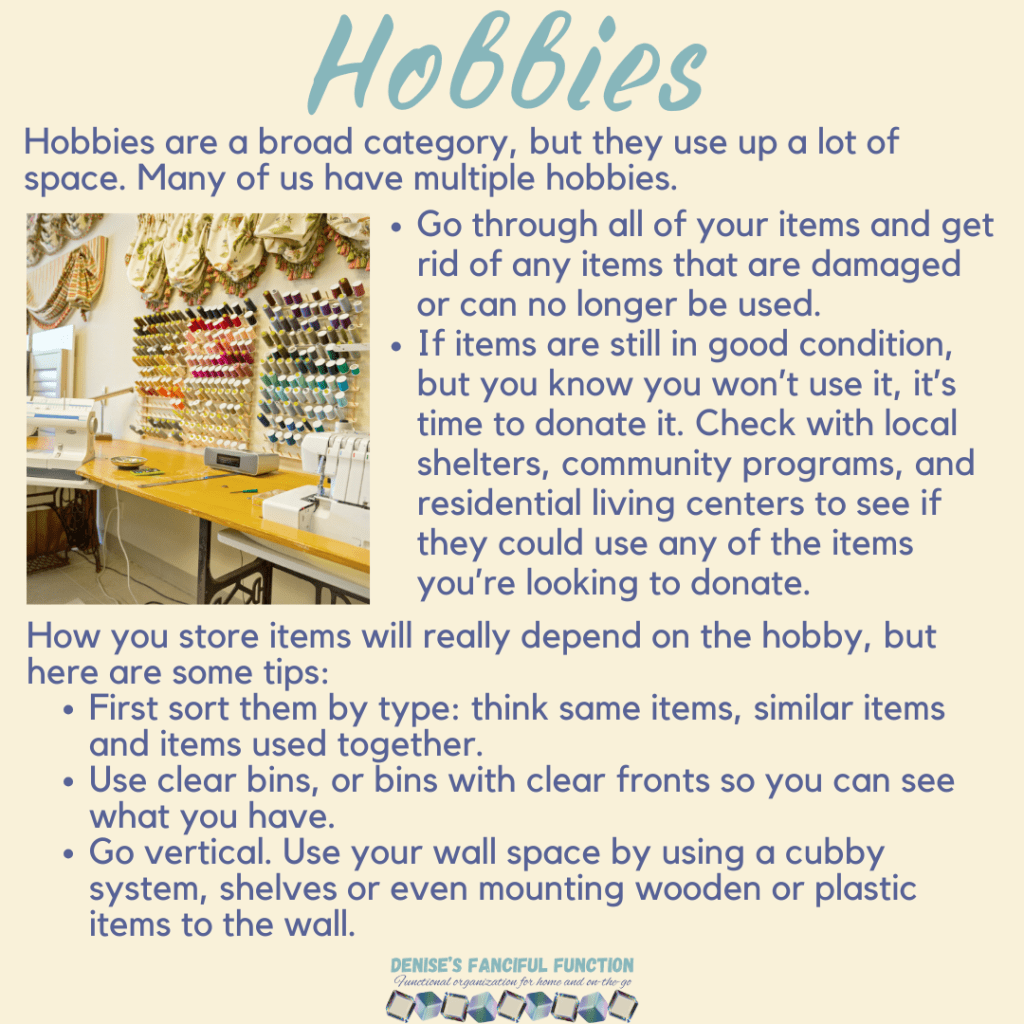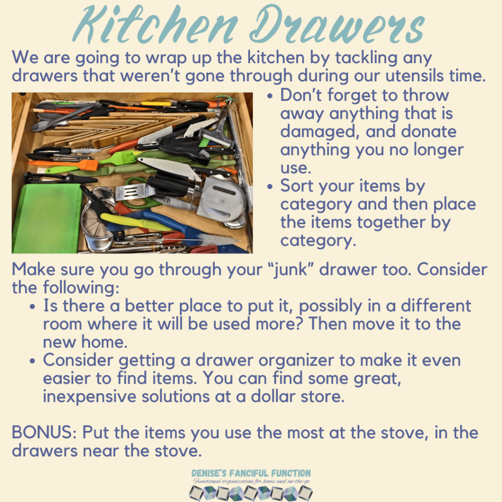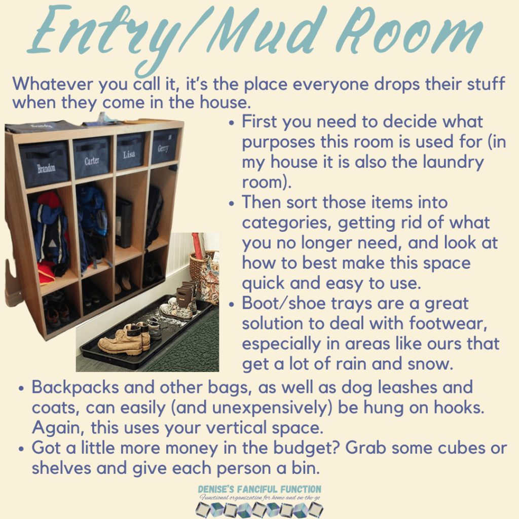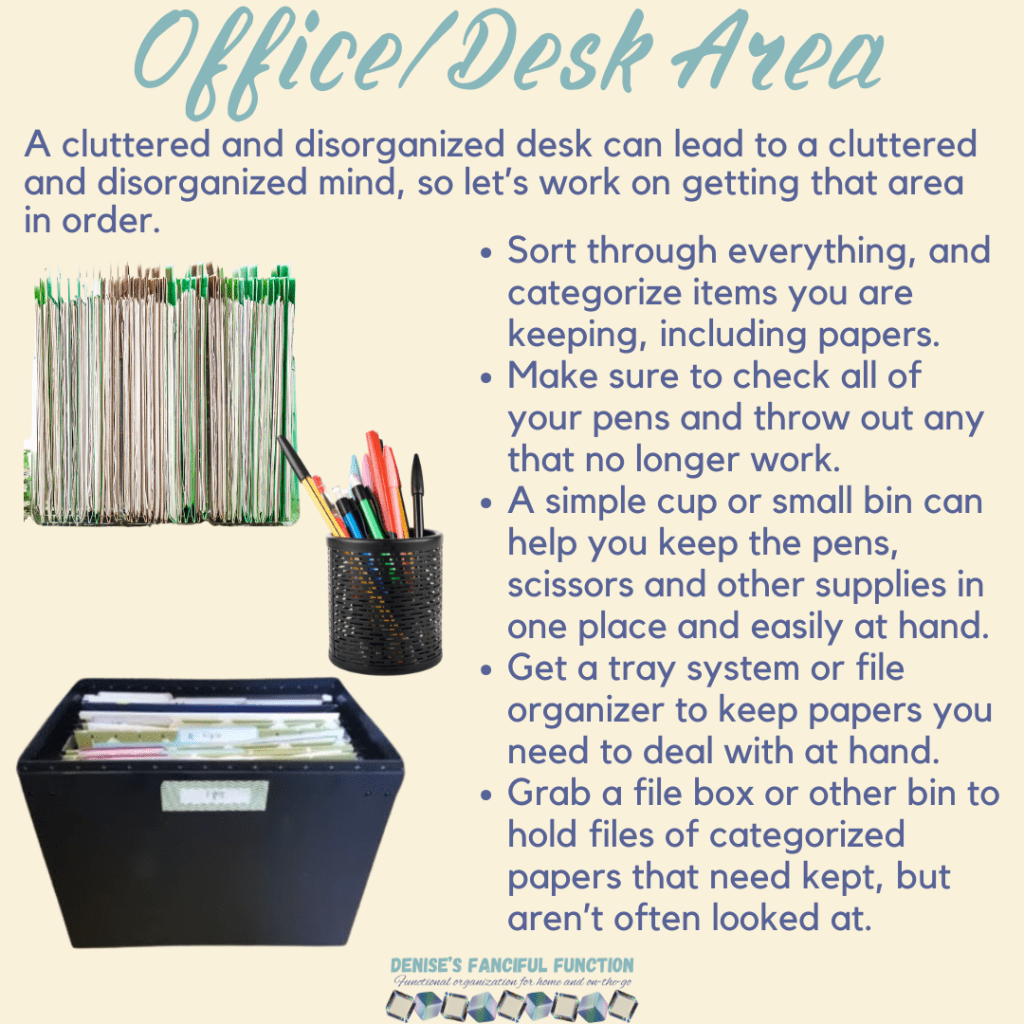 Want a quick view of the Organization Challenge we are holding in my Facebook group? Here are the basics. Want to be a part of the challenge AND be entered to win a gift certificate? Just go over to my Facebook group (https://www.facebook.com/groups/denisesfancifulfunction) and click on the Featured post for more information. Keep an eye out throughout the next couple months as I drop a space at a time for you.