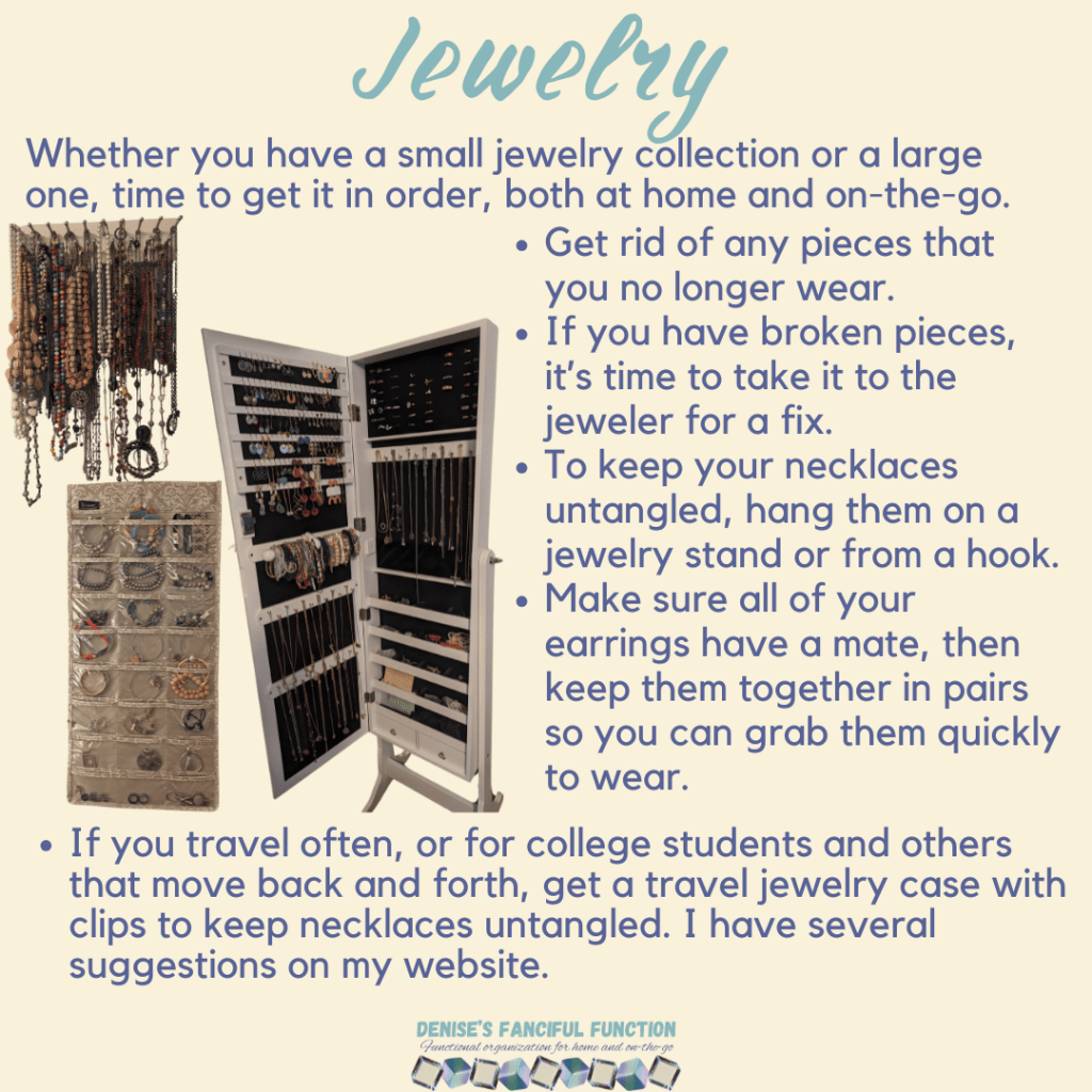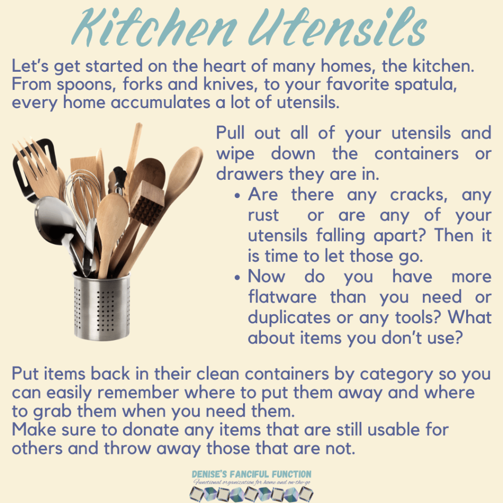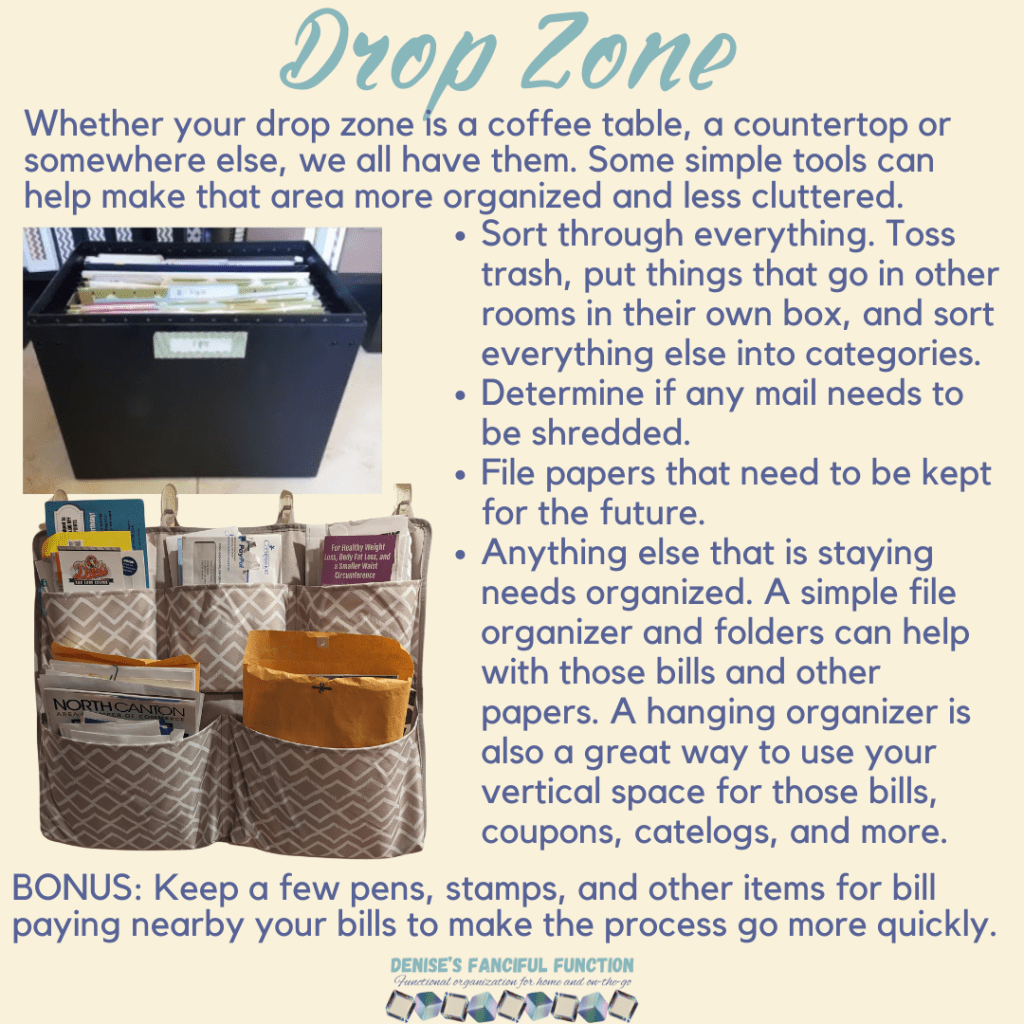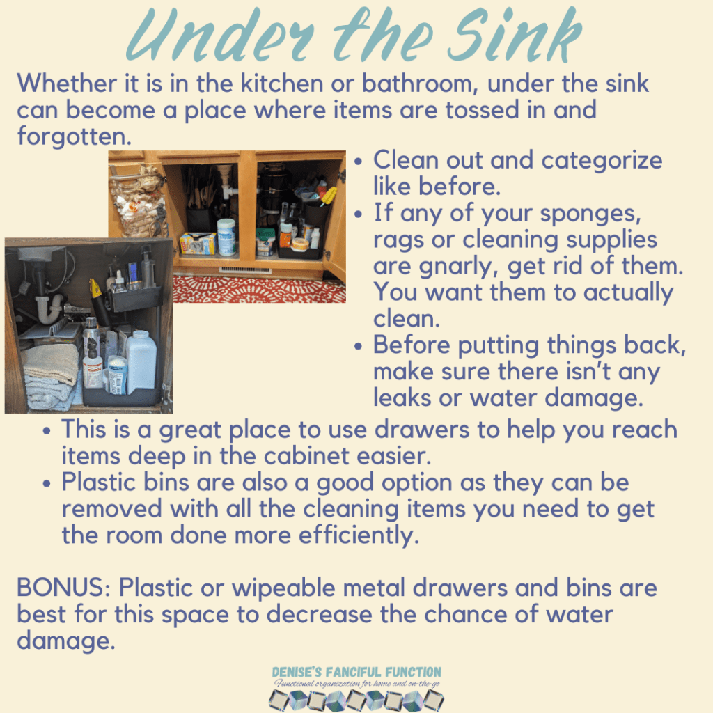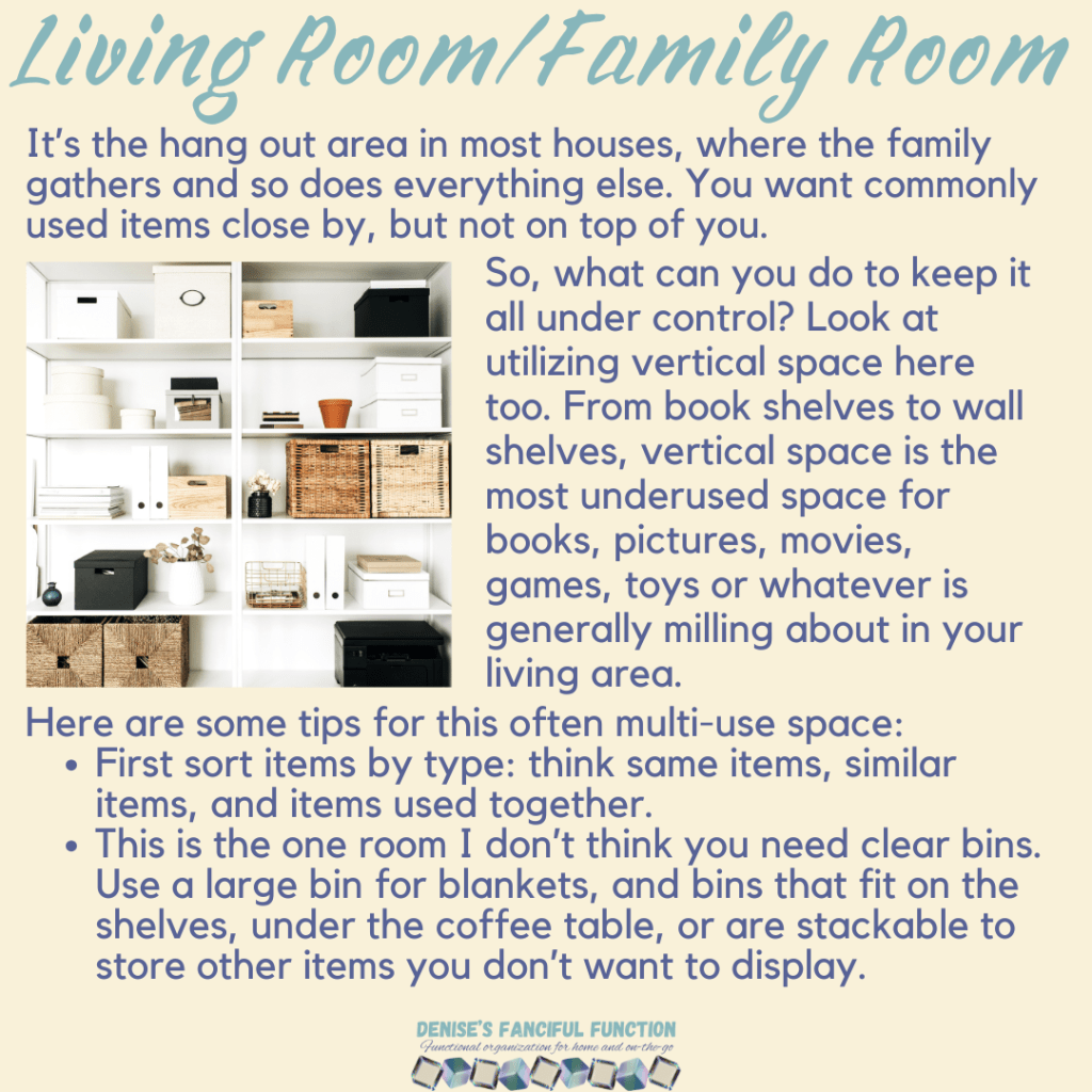 Want a quick view of the Organization Challenge we are holding in my Facebook group? Here are the basics. Want to be a part of the challenge AND be entered to win a gift certificate? Just go over to my Facebook group (https://www.facebook.com/groups/denisesfancifulfunction) and click on the Featured post for more information. Keep an eye out throughout the next couple months as I drop a space at a time for you.