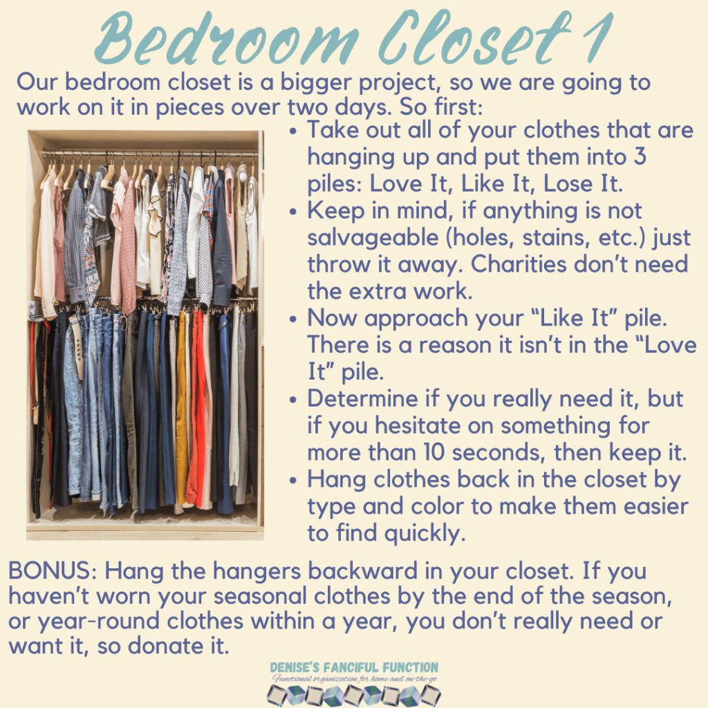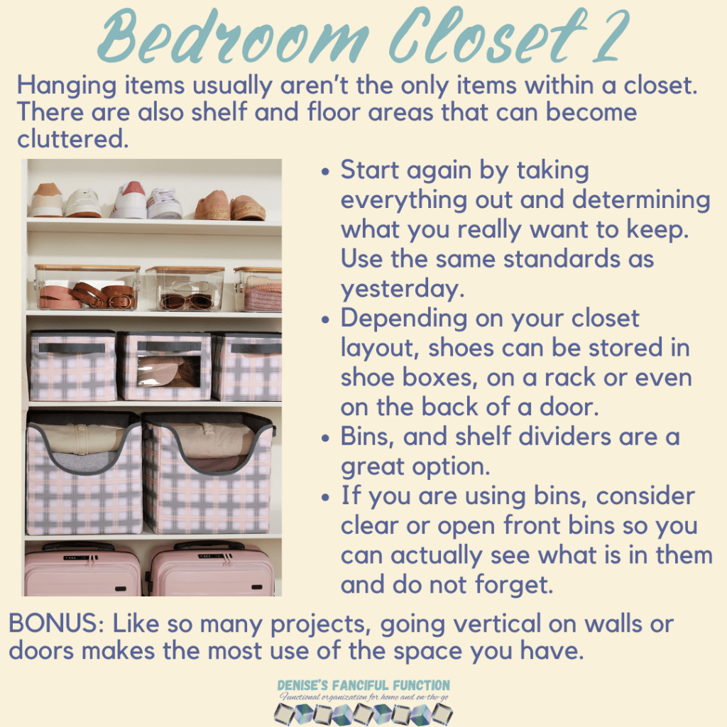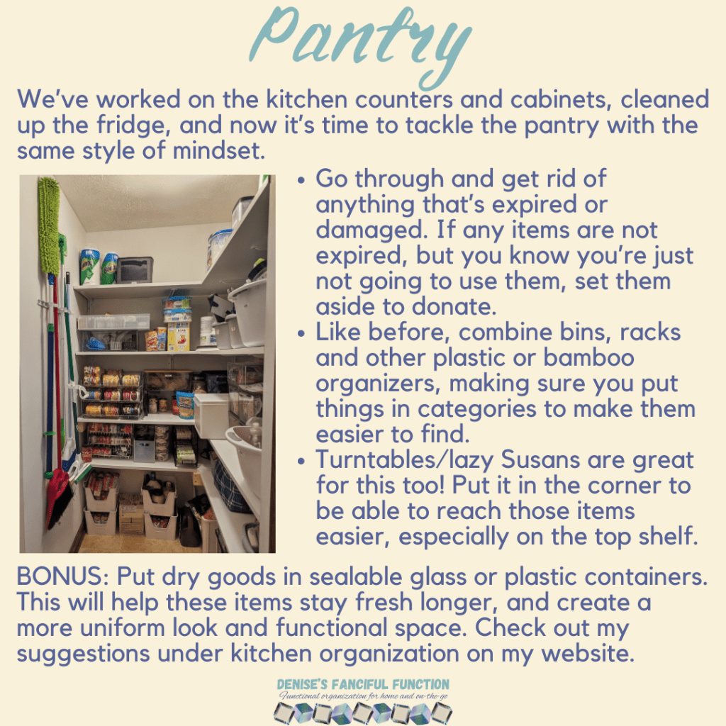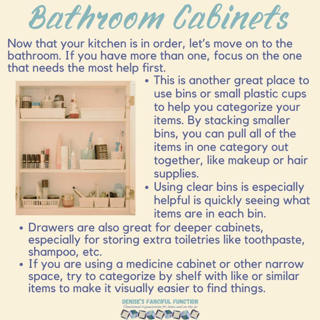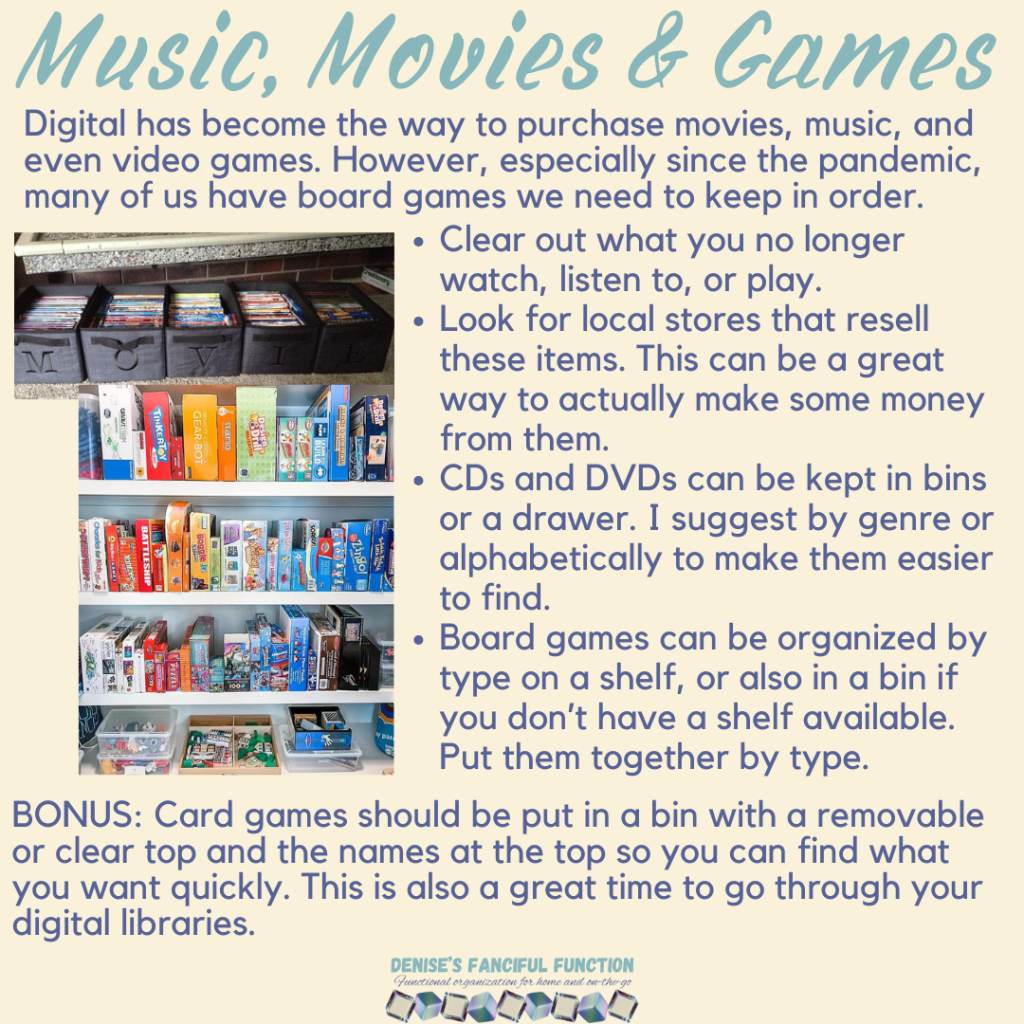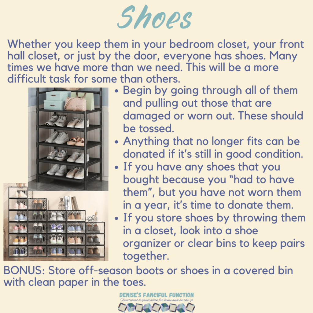 Want a quick view of the Organization Challenge we are holding in my Facebook group? Here are the basics. Want to be a part of the challenge AND be entered to win a gift certificate? Just go over to my Facebook group (https://www.facebook.com/groups/denisesfancifulfunction) and click on the Featured post for more information. Keep an eye out throughout the next couple months as I drop a space at a time for you.